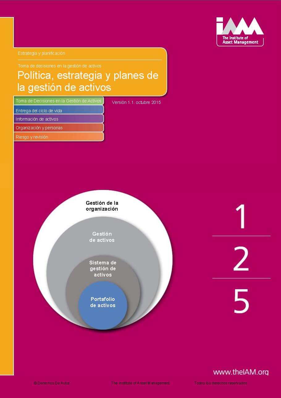 Este documento proporciona una guía en los siguientes elementos de la gestión de activos: • Política de la gestión de activos • Estrategia de la gestión de activos • Planes de la gestión de activos El documento también sugiere el uso del marco de actuación de la gestión de activos como un enfoque de buena práctica para transmitir la conectividad de la gestión de activos y otros procesos del negocio.