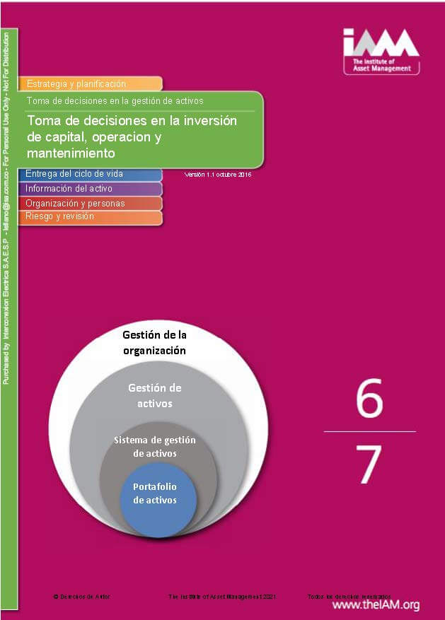 Este documento es una guía para los siguientes elementos de la gestión de activos: • Toma de decisiones de inversión de capital. • Toma de decisiones en operaciones y mantenimiento. El alcance incluye la toma de decisiones para todas las actividades del ciclo de vida de gestión de activos.