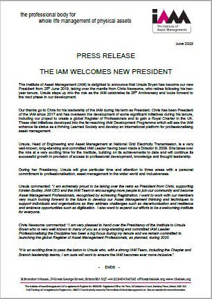 The Institute of Asset Management (IAM) is delighted to announce that Ursula Bryan has become our new President from 25th June 2019, taking over the mantle from Chris Newsome, who retires following his two-year tenure. Ursula steps up into the role as the IAM celebrates its 25th Anniversary and looks forward to the next phase in our development.