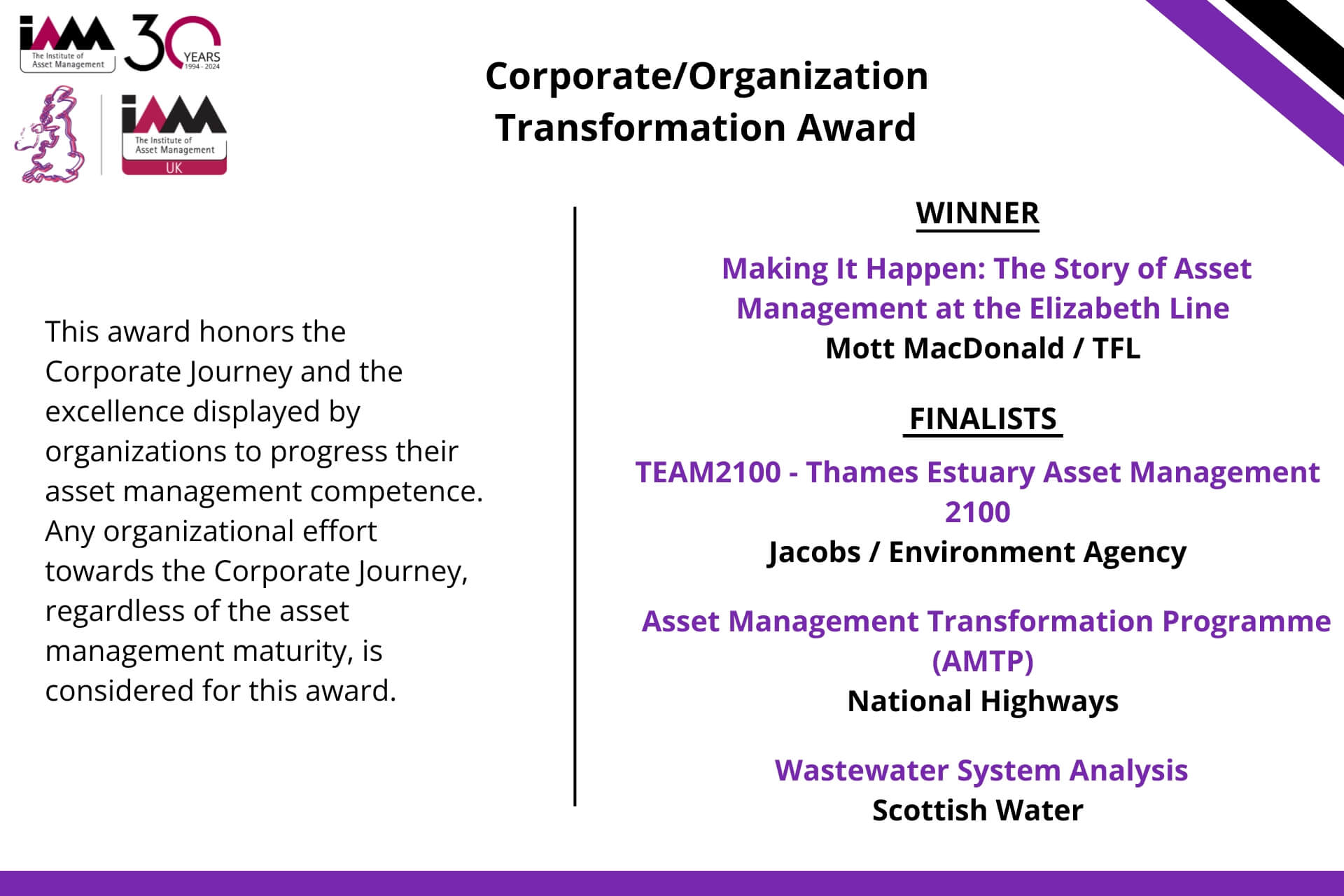 Making It Happen: The Story of Asset Management at the Elizabeth Line (Mott MacDonald / TFL) was the winner of the Corporate/Organization Transformation Award.