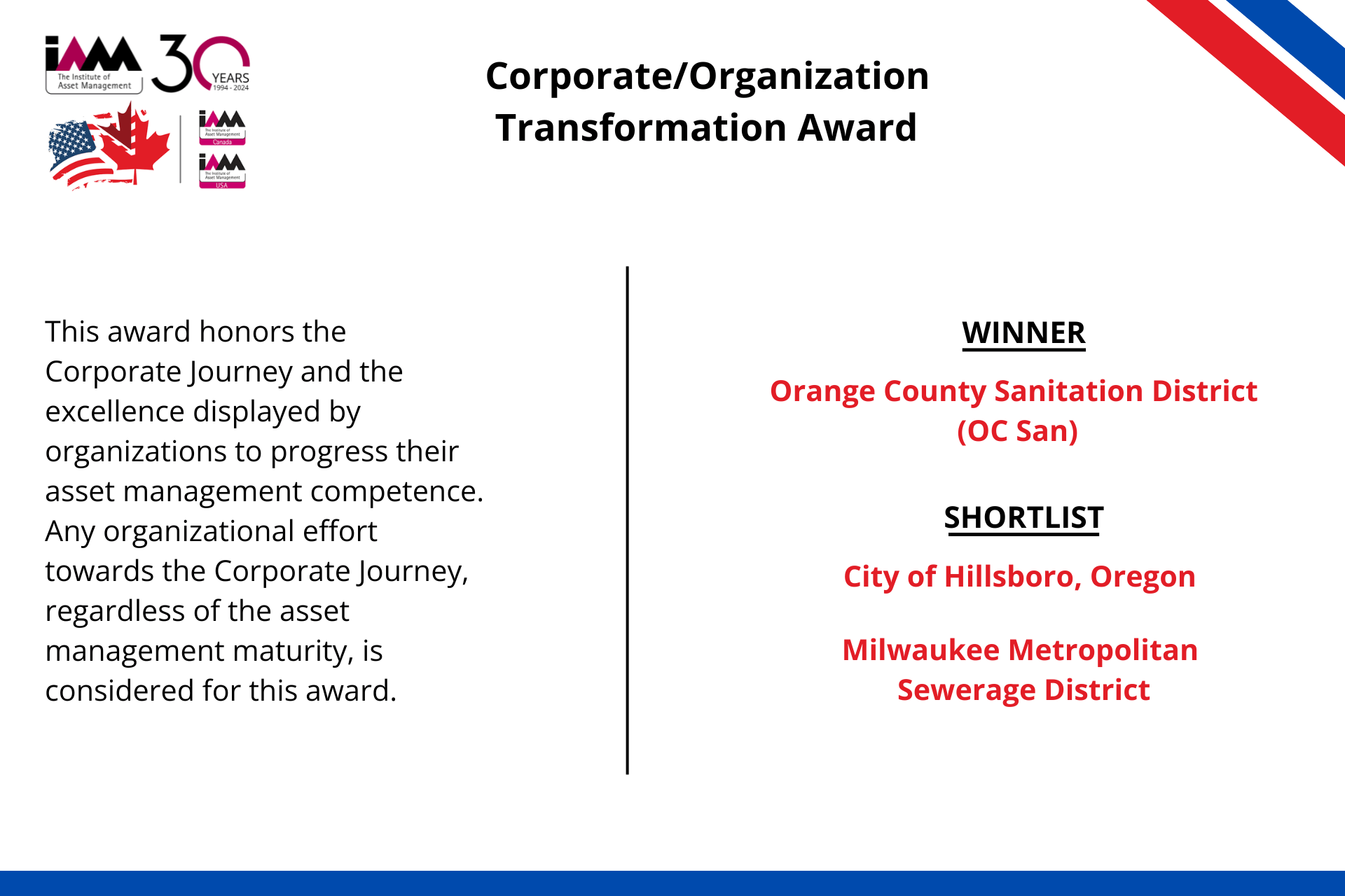 Orange County Sanitation District was the winner of the Corporate/Organization Transformation award.